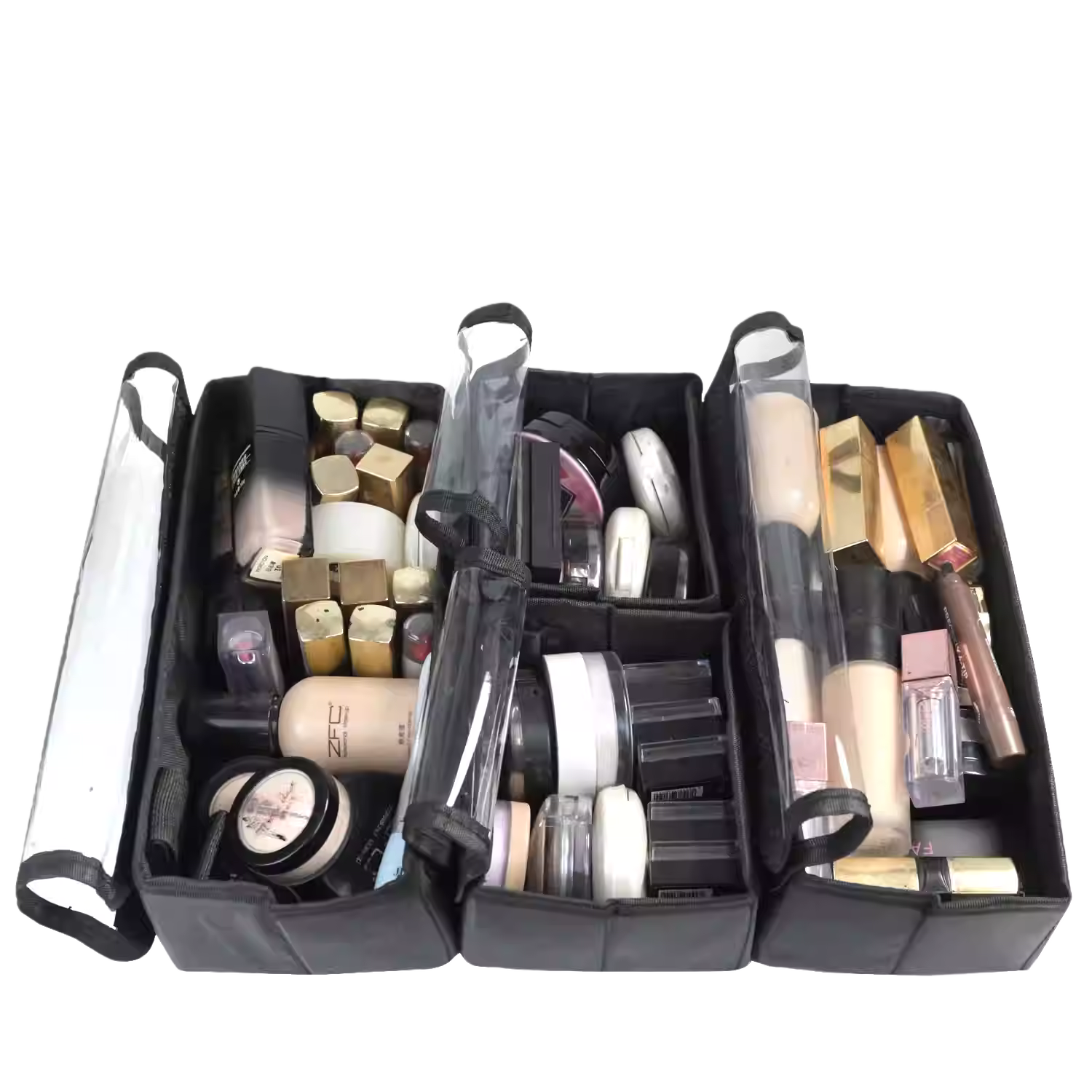 粉底、刷具、瓶罐分區放置,不再互相碰撞、傾倒。