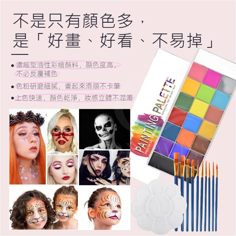20色油性臉彩組合|高飽和不褪色臉部彩繪顏料|兒童萬聖節舞台派對專用|附刷具模板調色盤