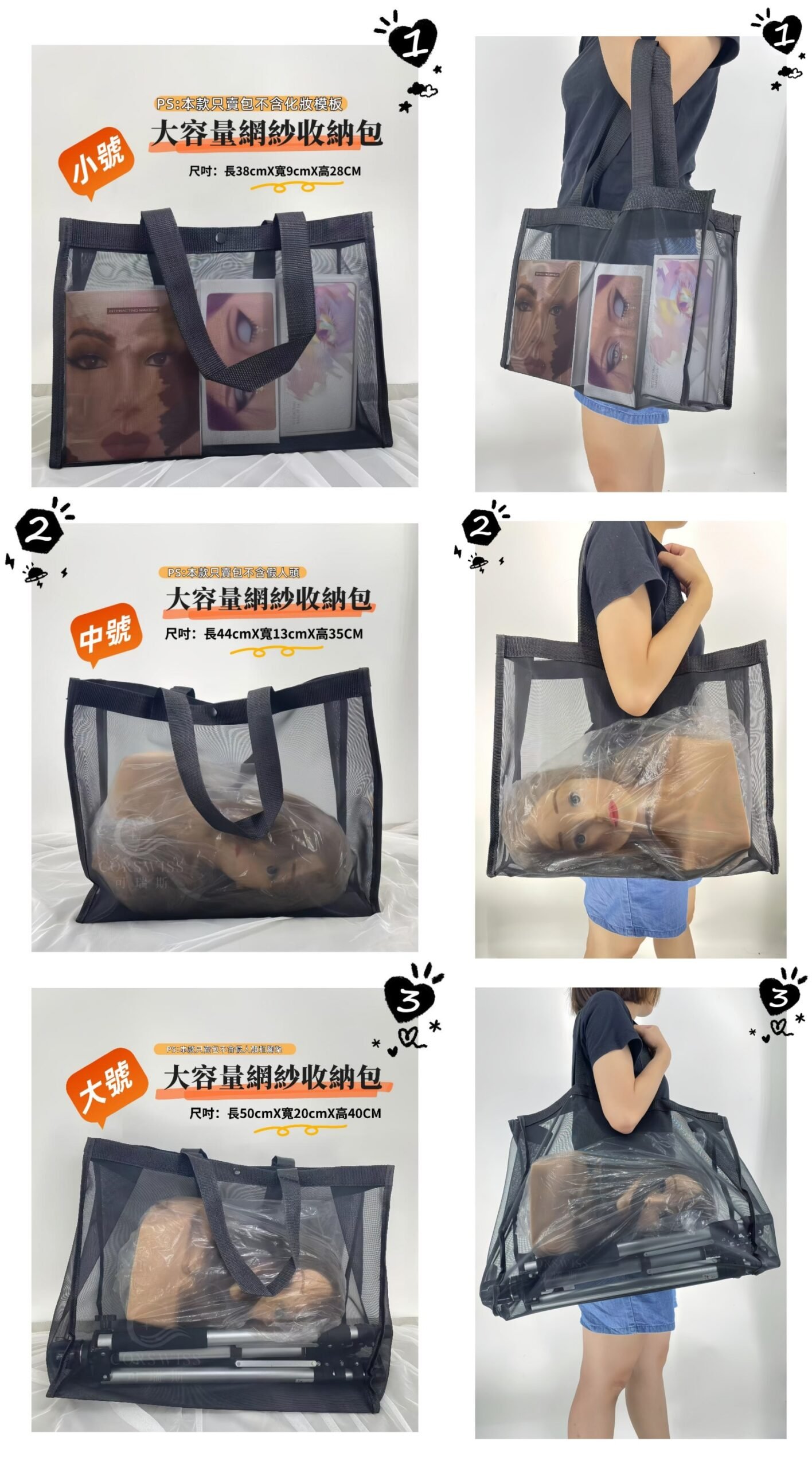 - 假人頭模型:網紗紗線特性可避免發模悶濕,硬挺結構防止變形。
